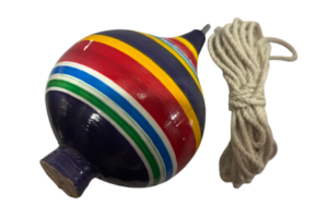 Trompo de madera pintado a mano, una pieza clásica que une la diversión tradicional con el arte artesanal mexicano.